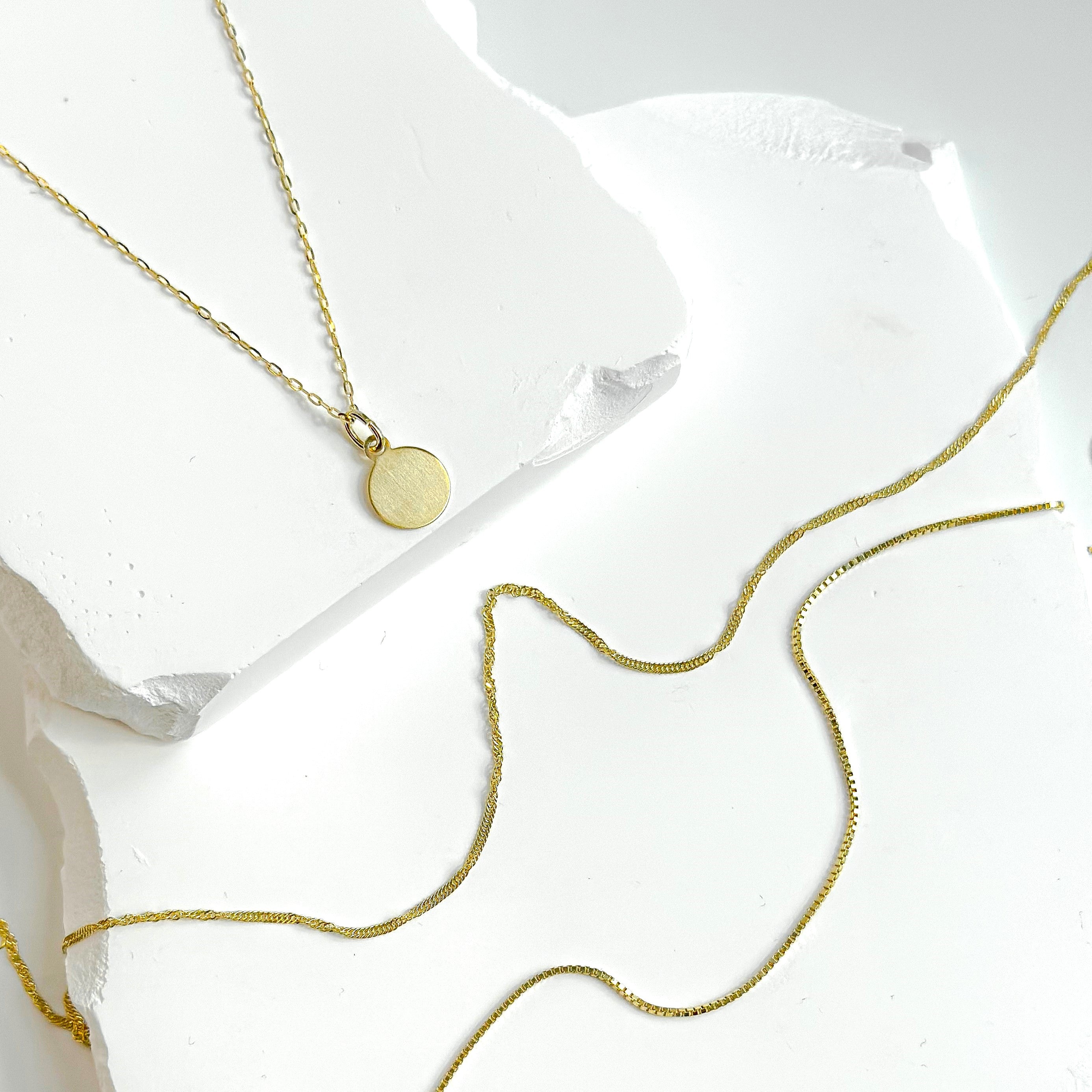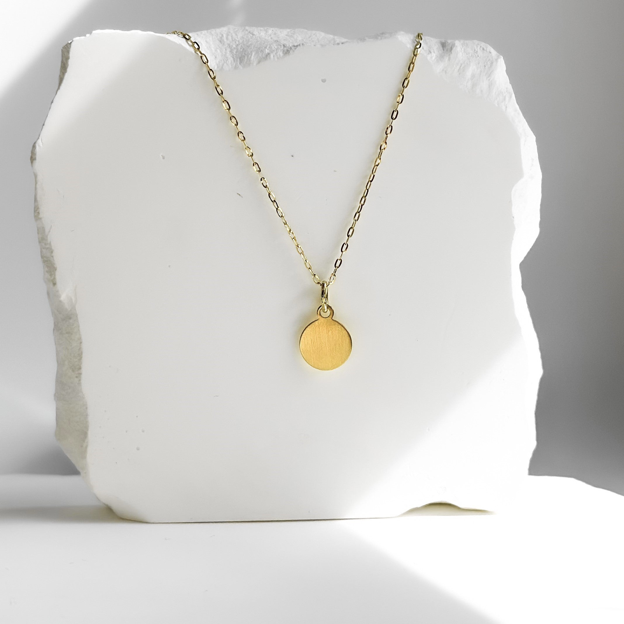 Veredle dein Outfit mit der Chiara Coin Halskette aus 8k Echtgold. Der zarte Anhänger ist vielseitig tragbar und verleiht deinem Look das gewisse Etwas - du kannst die glänzende Seite oder die matte Oberseite tragen - eine Halskette für alle Gelegenheiten!