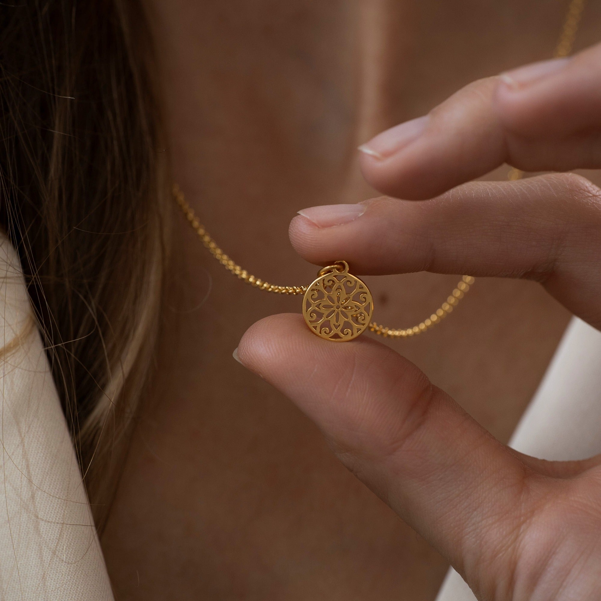 Dieser zarte Anhänger hat die Form eines Ornaments und hängt an einer filigranen Kette. Ein schönes Stück, das deinem Outfit einen dezenten Akzent verleiht. Ideal als Geschenk an sich selbst, die Partnerin oder die beste Freundin.