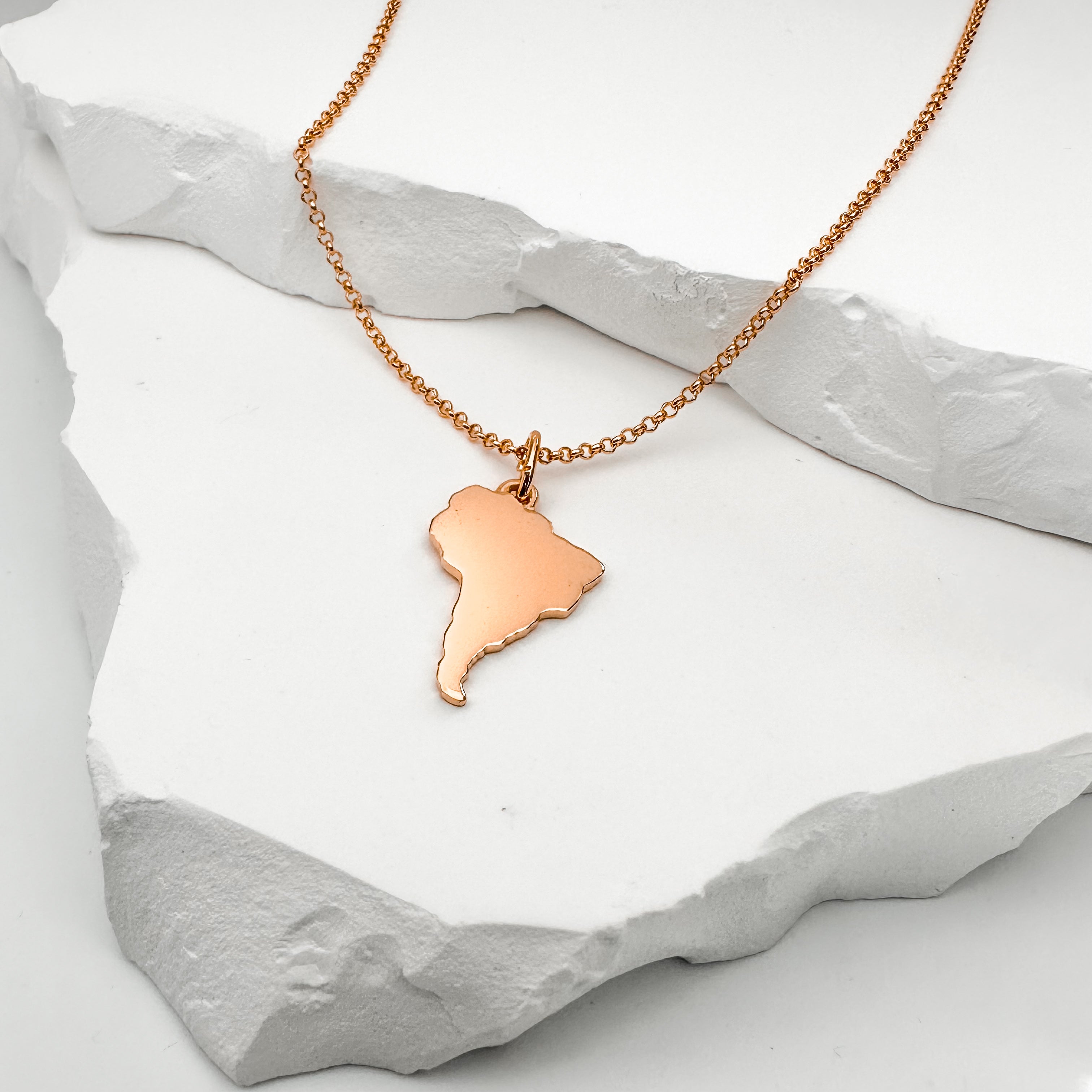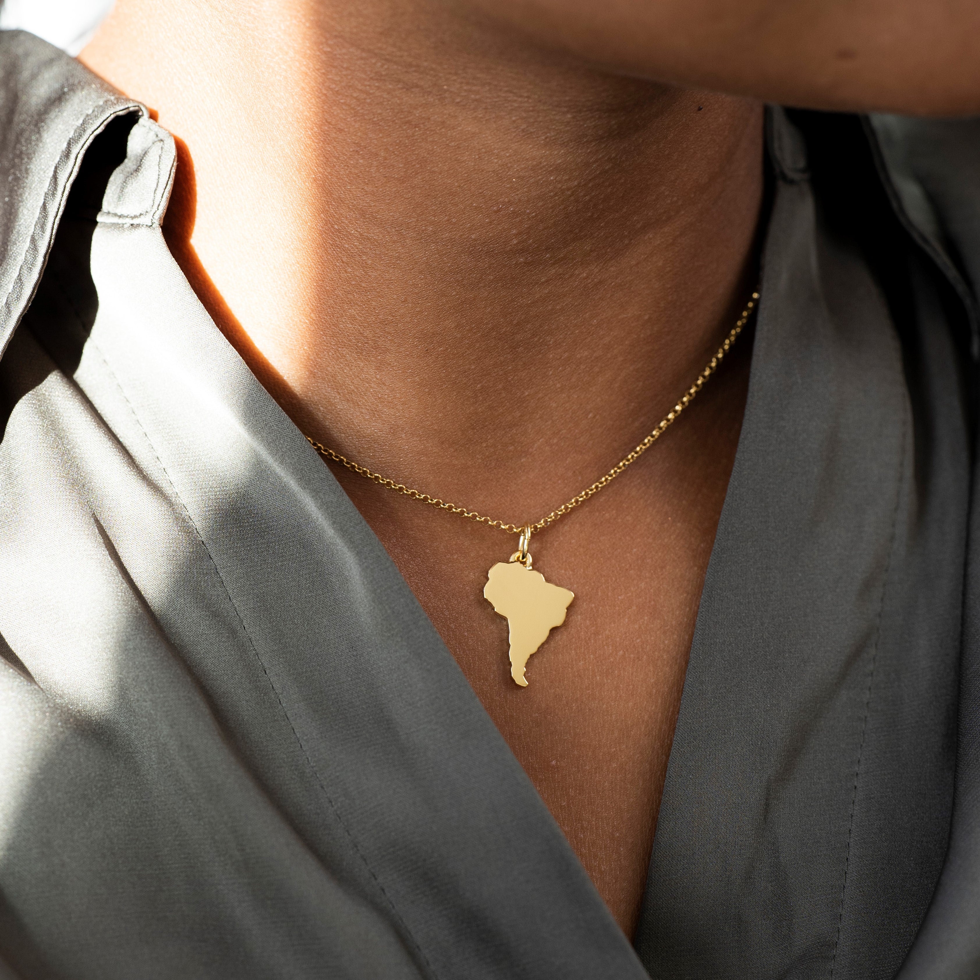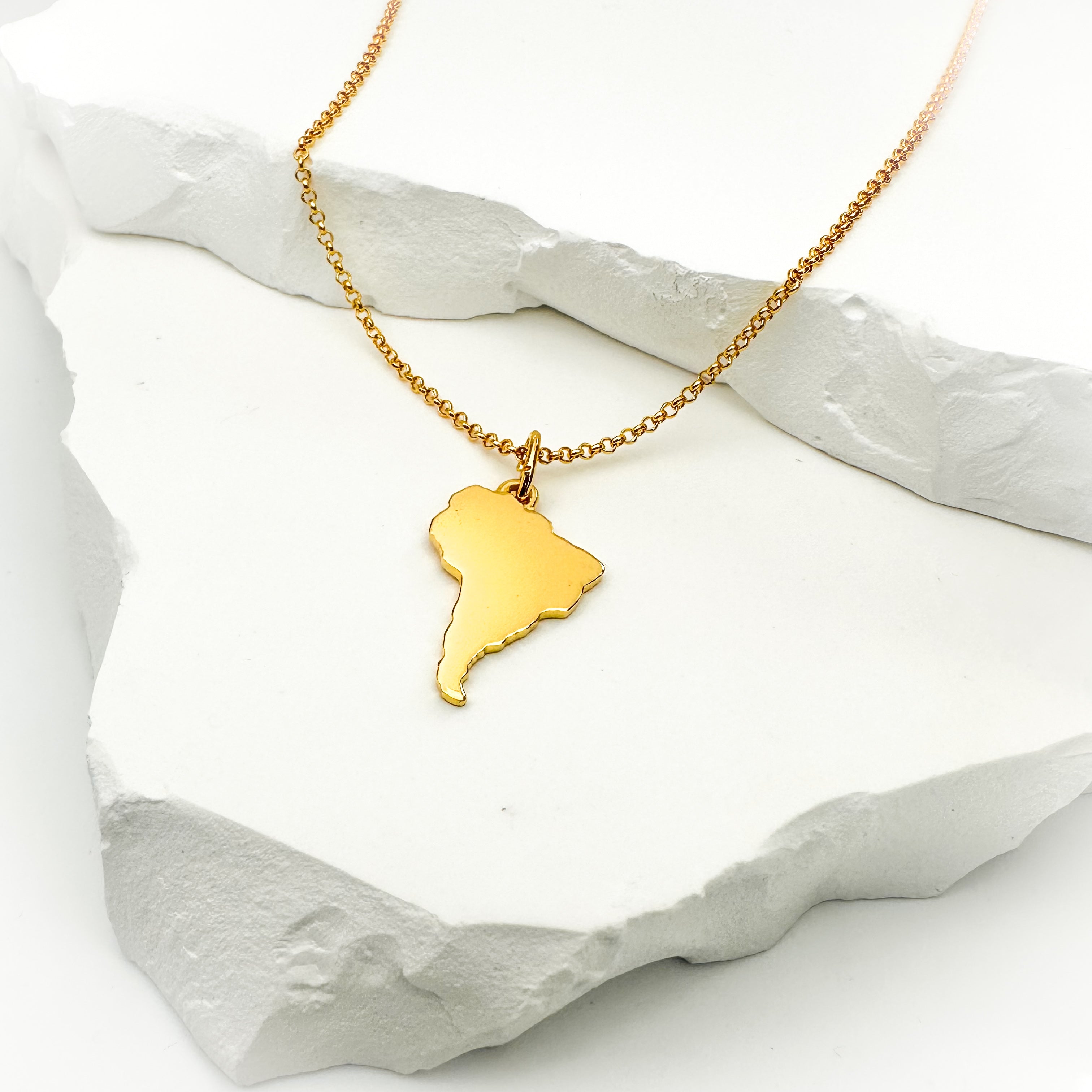 Dieser filigrane Anhänger zeigt die Umrisse Südamerikas und hängt an einer feinen Kette. Ein besonderes Stück, das dich an unvergessliche Momente auf deinen Reisen und an die Schönheit Südamerikas erinnern soll.